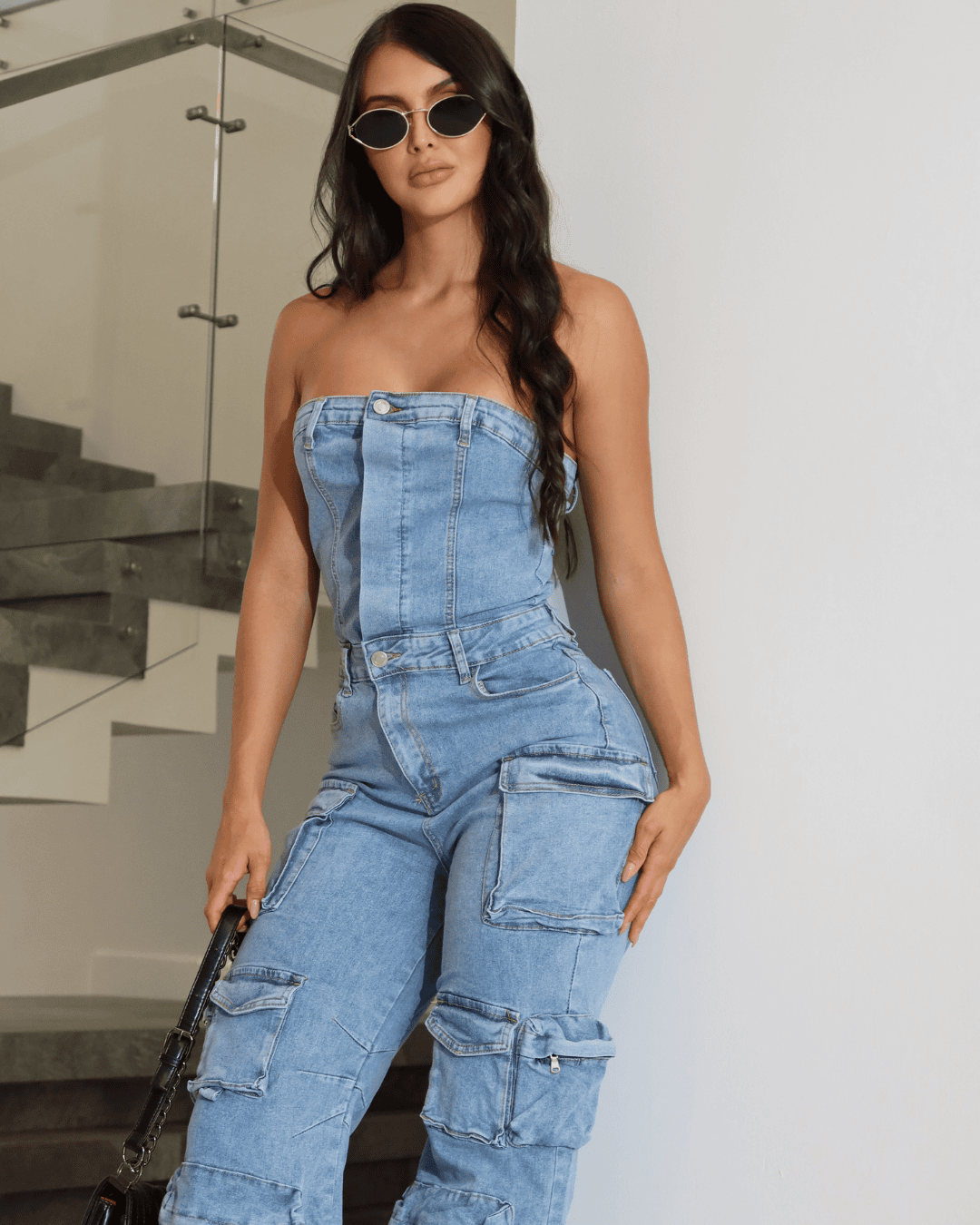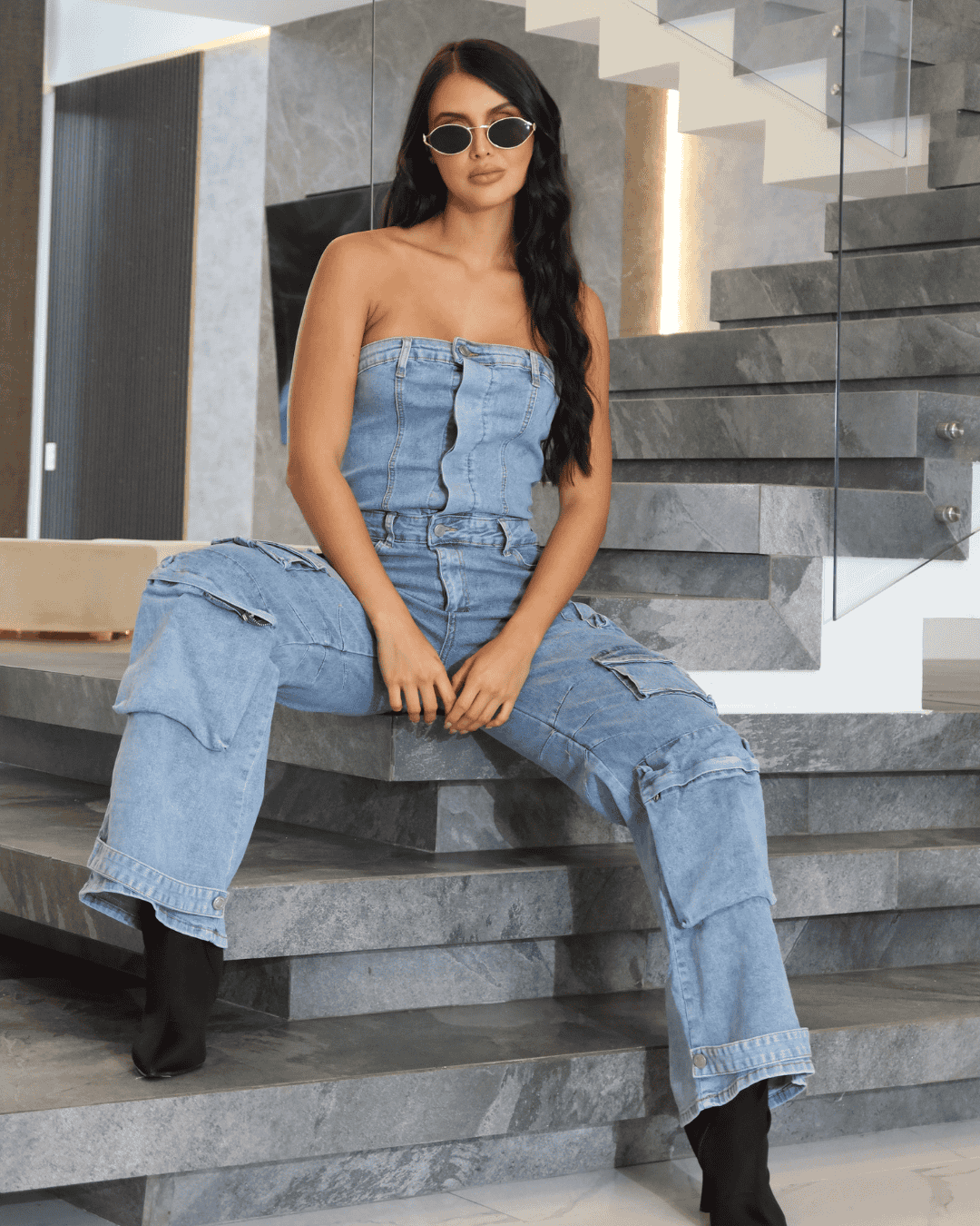 Diseñado en jean índigo suave al tacto, se ajusta con firmeza pero sin apretar, logrando una horma preciosa que acompaña tus movimientos y realza tus curvas. El escote straple deja los hombros al descubierto, dándole un toque sensual y moderno, mientras los bolsillos tipo cargo le aportan actitud y funcionalidad.