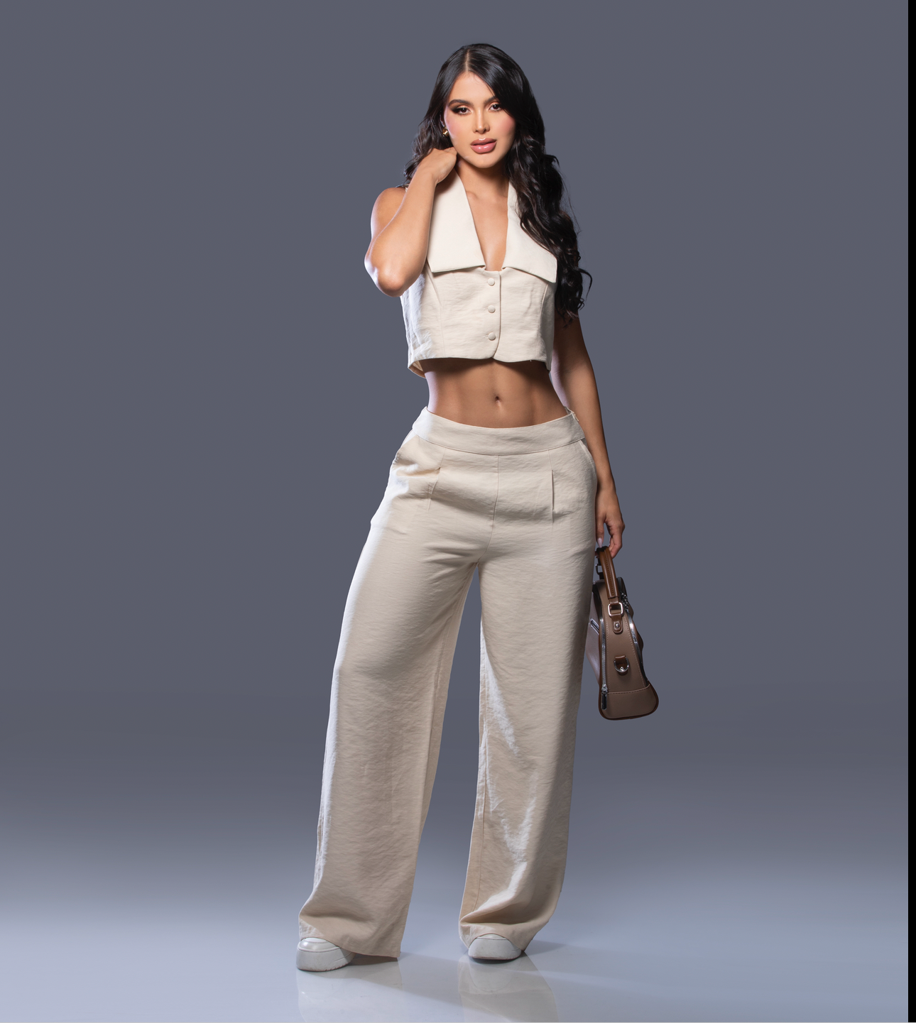 Un conjunto que combina elegancia y comodidad en cada detalle. El chaleco con cuello aporta carácter y sofisticación, mientras el pantalón completa un look versátil que te hará sentir segura, femenina y con estilo propio. Una prenda pensada para acompañarte en los momentos donde quieres brillar.